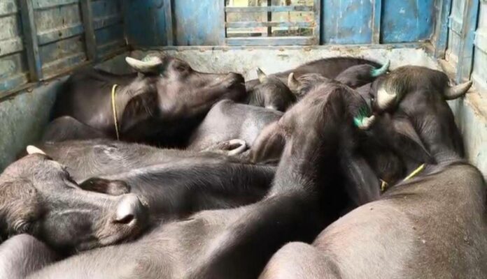 ମୟୂରଭଞ୍ଜ: ମୟୂରଭଞ୍ଜ ଜିଲ୍ଲାରେ ଦିନକୁଦିନ ବୃଦ୍ଧି ପାଇବାରେ ଲାଗିଛି ବେଆଇନ ଗୋରୁ,ଗାଈ ଓ ମଇଁଷି ଚାଲାଣ । ତେବେ ପୋଲିସ ପକ୍ଷରୁ ମଧ୍ୟ ଏହି ବେଆଇନ ଚାଲାଣ ଉପରେ ରୋକ ଲଗାଇବା ପାଇଁ ଚେଷ୍ଟାଜାରୀ ରହିଥିବା ଦେଖିବାକୁ ମିଳିଛି।ବେଆଇନ ମଇଁଷି ଚାଲାଣ ବେଳେ ୧୫ଟି ମଇଁଷି ଉଦ୍ଧାର ହେବା ସାଙ୍ଗକୁ ବେଆଇନ ଭାବେ ବୋଝେଇ କରି ନେଉଥିବା ୨ଟି ପିକଅଫ ଗାଡି ଜବତ ସହ ୨ ଡ୍ରାଇଭର ଅଟକ ରଖିଛି ପୋଲିସ। ମୟୂରଭଞ୍ଜ ଜିଲ୍ଲା ଠାକୁରମୁଣ୍ଡା ଥାନା ଅନ୍ତର୍ଗତ ୫୩ ନଂ ରାଜ୍ୟ ରାଜପଥ ଠାକୁରମୁଣ୍ଡା- କରଞ୍ଜିଆ ରାସ୍ତାର କେନ୍ଦୁଜିଆଣୀ ଶିଶୁ ମନ୍ଦିର ନିକଟରୁ ଠାକୁରମୁଣ୍ଡା ଥାନା ପୋଲିସ ଆଜି ଭୋର ସକାଳୁ ପେଟ୍ରୋଲିଂ କରୁଥିବା ସମୟରେ ୨ଟି ପିକଅପ୍ ଗାଡିକୁ ଜବତ କରି ୧୫ଟି ମଇଁଷି ଉଦ୍ଧାର କରିଛି। ଜବତ ମଇଁଷିର ସ୍ୱାସ୍ଥ ପରୀକ୍ଷା ପରେ ନୀକଟସ୍ଥ ଗୋଶାଳାରେ ଛଡା ଯିବ ବୋଲି ଠାକୁରମୁଣ୍ଡା ଥାନା ଅଧିକାରିଣୀ ସାବିତ୍ରୀ ଦଳେଇଙ୍କ ଠାରୁ ମିଳିଥିବା ସୂଚନାରୁ ଜଣାପଡିଛି। ଏନେଇ ଠାକୁରମୁଣ୍ଡା ଥାନାରେ ମାମଲା ରୁଜୁ କରି ଅଧିକ ତଦନ୍ତ କରୁଛି ପୋଲିସ। ତେବେ ମଇଁଷି ଗୁଡ଼ିକ ପ୍ରାଥମିକ ତଦନ୍ତ ବେଳେ ଯାଜପୁରରୁ ଝାରଖଣ୍ଡ ରାଞ୍ଚି ନେଉଥିବା ଜଣାପଡିଛି।