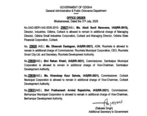 ୫.ପ୍ରଥମେଶ ଅରବିନ୍ଦ ରାଜେଶିରକେଙ୍କୁ ବ୍ରହ୍ମପୁର ଉନ୍ନୟନ କର୍ତ୍ତୁପକ୍ଷର ଅତିରିକ୍ତ ଦାୟିତ୍ୱ ମିଳିଛି ।