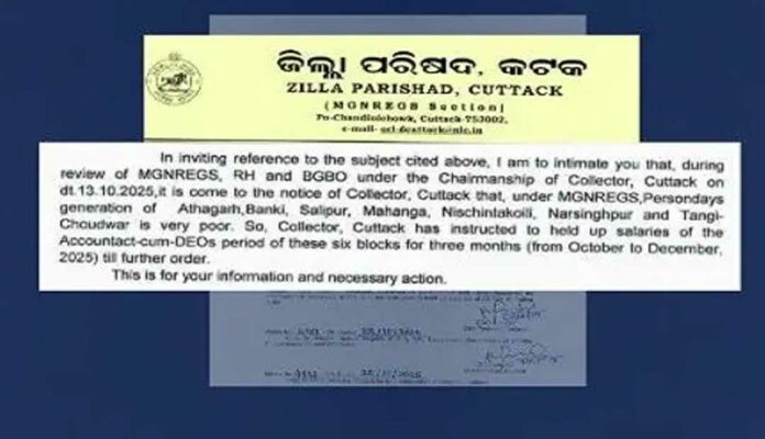 କଟକ: କଟକ କଲେକ୍ଟର ୭ଟି ବ୍ଲକ ଡିଇଓଙ୍କ ଦରମା ବନ୍ଦ କରିବାକୁ ନିର୍ଦ୍ଦେଶ ଜାରି କରିଛନ୍ତି।MRNEGA କାର୍ଯ୍ୟର ସମୀକ୍ଷା ସମୟରେ କଲେକ୍ଟର ଅସନ୍ତୁଷ୍ଟ ଥିଲେ। ସେ ଅକ୍ଟୋବରରୁ ଡିସେମ୍ବର ପର୍ଯ୍ୟନ୍ତ ଏମାନଙ୍କର ଦରମା ସ୍ଥଗିତ ରଖିବାକୁ ନିର୍ଦ୍ଦେଶ ଦେଇଥିଲେ।ଚିଠିରେ ଉଲ୍ଲେଖ କରାଯାଇଛି ଯେ ଆଠଗଡ଼, ବାଙ୍କି, ସାଲେପୁର, ମାହାଙ୍ଗା, ନିଶ୍ଚିନ୍ତକୋଇଲି, ନରସିଂହପୁର ଏବଂ ଟାଙ୍ଗୀ ଚୌଦ୍ୱାର ବ୍ଲକରେ MRNEGA କାମ ଠିକ୍ ଭାବରେ ହେଉନାହିଁ।ଏହି ବ୍ଲକର ବିଡିଓମାନଙ୍କୁ ଦରମା ବନ୍ଦ କରିବାକୁ ନିର୍ଦ୍ଦେଶ ଦିଆଯାଇଛି। ଏମ୍ଆରନେଗା ଏବଂ ଗ୍ରାମୀଣ ଗୃହ ଯୋଜନା କାର୍ଯ୍ୟରେ ଅବହେଳା ପାଇଁ ସାଲେପୁର ବିଡିଓ କଠୋର କାର୍ଯ୍ୟାନୁଷ୍ଠାନ ଗ୍ରହଣ କରିଛନ୍ତି।ସାଲେପୁର ବ୍ଲକର ସହକାରୀ ଯନ୍ତ୍ରୀ, କନିଷ୍ଠ ଯନ୍ତ୍ରୀ, ପିଇଓ ଏବଂ ଏଡିଇଓଙ୍କ ଦରମା ବନ୍ଦ କରିଦେଇଛନ୍ତି ସାଲେପୁର ବିଡିଓ।