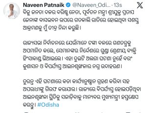 ଭୁବନେଶ୍ୱର: ବିଜୁ ଜନତା ଦଳର ବରିଷ୍ଠ ନେତା ପୂର୍ବତନ ମନ୍ତ୍ରୀ ପ୍ରତାପ ଜେନାଙ୍କ ବାସଭବନ ଉପରେ ଗତକାଲି ରାତିରେ ହୋଇଥିବା ସଶସ୍ତ୍ର ଆକ୍ରମଣକୁ ତୀବ୍ର ନିନ୍ଦା କରିବା ସହ ତୁରନ୍ତ ଏହି ଘଟଣାରେ କଡା କାର୍ଯ୍ୟାନୁଷ୍ଠାନ ଗ୍ରହଣ କରିବା ସହ ଅପରାଧୀଙ୍କୁ ଗିରଫ କରାଯାଉ ବୋଲି ସୋସିଆଲ ମିଡିଆରେ ପୋଷ୍ଟ କରିଛନ୍ତି ବିରୋଧୀ ଦଳ ନେତା ନବୀନ ପଟ୍ଟନାୟକ ।