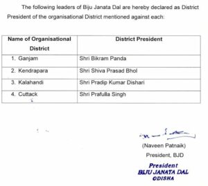ଭୁବନେଶ୍ୱର : ଆଉ ୪ ଜିଲ୍ଲା ପାଇଁ ବିଜେଡି ପକ୍ଷରୁ ସଭାପତି ନାଁ ଘୋଷଣା । ଏ ନେଇ ବିଜ୍ଞପ୍ତି ପ୍ରକାଶ ପାଇଛି । ଜାରି ବିଜ୍ଞପ୍ତି ଅନୁସାରେ..