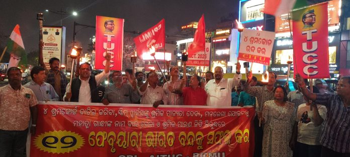 ଭାରତ ବର୍ଷର ଅଗଣିତ ଗରିବ ମଣିଷ, ଶ୍ରମିକ ଓ କୃଷକମାନଙ୍କ ଙ୍ ସ୍ୱାର୍ଥରକ୍ଷା ପାଇଁ ଏହି ସାଧାରଣ ଧର୍ମଘଟରେ ବିପୁଳ ସଂଖ୍ୟାରେ ସାମିଲ ହୋଇ ଏହାକୁ ସଫଳ କରିବା ପାଇଁ ଏକ ପ୍ରେସ ଇସ୍ତାହାର ମାଧ୍ୟମରେ ଫରୱାର୍ଡ ବ୍ଲକର ରାଜ୍ୟ ସାଧାରଣ ସଂମ୍ପାଦକ ଜ୍ୟୋତି ରଞ୍ଜନ ମହାପାତ୍ର ଆହ୍ୱାନ କରିଛନ୍ତି। ଅନ୍ୟ ପଟରେ ଦେଶ ଓ ଦେଶର ଶ୍ରମିକ ଶ୍ରେଣୀର ସ୍ୱାର୍ଥ ରକ୍ଷା ପାଇଁ ଆହୁତ ଏହି ସାଧାରଣ ଧର୍ମଘଟରେ ଓଡିଶା ର ଜନସାଧାରଣ ସମର୍ଥନ ଜଣାଇ ଏହି ଧର୍ମଘଟରେ ସାମିଲ ହେଵା ପାଇଁ ଫରୱାର୍ଡ ବ୍ଲକ ପକ୍ଷରୁ ଆହ୍ୱାନ କରାଯାଇଛି l ଆସନ୍ତା କାଲି ର ହରତାଳ କୁ ସଫଳ କରିବା ପାଇଁ ଆଜି ସନ୍ଧ୍ୟାରେ ବିଭିନ୍ନ କେନ୍ଦ୍ରୀୟ ଶ୍ରମିକ ସଂଗଠନ ମାନଙ୍କ ପକ୍ଷରୁ ଏକ ମଶାଲ ଶୋଭାଯାତ୍ରା ଭୁବନେଶ୍ୱର ମାଷ୍ଟର କ୍ୟାଣ୍ଟିନ ଛକରୁ ବାହାରି ରାଜମହଲ ଛକ ପର୍ଯ୍ୟନ୍ତ ଯାଇଥିଲା l ଏହି ଅବସରରେ ବକ୍ତବ୍ୟ ରଖି ଶ୍ରମିକନେତା ମାନେ ଆସନ୍ତା କାଲି ର ଦେଶବ୍ୟାପୀ ହରତାଳ ରେ ସାମିଲ ହେବାକୁ ଜନଗଣଙ୍କୁ ଆହ୍ୱାନ କରିଥିଲେ l