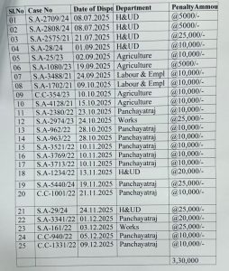 ଭୁବନେଶ୍ୱର : ଆଉ ସରକାରୀ ବାବୁଙ୍କ ମନମାନି ଚଳିବ ନାହିଁ। ଆର୍ଟିଆଇ ତଥ୍ୟକୁ ଅଣଦେଖା କଲେ ଗଣିବେ ତଣ୍ଡ। ଠିକ୍ ସମୟରେ ତଥ୍ୟ ନଦେବା, ଆଦୌ ତଥ୍ୟ ନଦେବା ଏବଂ ଅସମ୍ପୂର୍ଣ୍ଣ ତଥ୍ୟ ଦେଇ ଭ୍ରମିତ କରିବା ସରକାରୀ ବାବୁଙ୍କୁ ମହଙ୍ଗା ପଡ଼ିଛି। ଯାହାକୁ ନେଇ ରାଜ୍ୟ ସୂଚନା କମିଶନର ପ୍ରାଣବିନ୍ଦୁ ଆଚାର୍ଯ୍ୟ କଠୋର ହୋଇଛନ୍ତି। ଗତ ୬ମାସ ମଧ୍ୟରେ ଆର୍ଟିଆଇ ତଥ୍ୟକୁ ଅଣଦେଖା କରିଥିବା ଗୃହନିର୍ମାଣ ଓ ନଗର ଉନ୍ନୟନ ବିଭାଗ, କୃଷି, ପୂର୍ତ୍ତ, ପଞ୍ଚାୟତରାଜ, ଶ୍ରମ ଆଦି ୫ ବିଭାଗର ୨୫ ଅôଦକାରୀଙ୍କୁ ୩.୩ ଲକ୍ଷ ଟଙ୍କା ଜରିମାନା କରିଛନ୍ତି। ତେବେ ଏହି ତାଲିକାରେ ସବୁଠୁ ଆଗରେ ରହିଛି ପଞ୍ଚାୟତିରାଜ ବିଭାଗ। ପଞ୍ଚାୟତିରାଜ ବିଭାଗର ଆର୍ଟିଆଇ ତଥ୍ୟ ଦେଇ ନଥିବାରୁ ୧୧ଜଣ ଅଧିକାରୀଙ୍କୁ ୧.୧୫ଲକ୍ଷ ଟଙ୍କା ଜରିମାନା କରାଯାଇଛି। ସେହିପରି ଗୃହନିର୍ମାଣ ଓ ନଗର ଉନ୍ନୟନ ବିଭାଗ ତଥ୍ୟ ଦେଇନଥିବା ୬ଜଣ ଅଧିକାରୀଙ୍କୁ ୯୦ ହଜାର, ପୂର୍ତ୍ତବିଭାଗର ୨ଜଣ ଅଧିକାରୀଙ୍କୁ ୫୦ ହଜାର ଏବଂ କୃଷି ବିଭାଗର ୪ଜଣ ଅଧିକାରୀଙ୍କୁ ୩୫ ହଜାର ଏବଂ ଶ୍ରମ ବିଭାଗର ୨ଜଣ ଅଧିକାରୀଙ୍କୁ ୨୦ ହଜାର ଟଙ୍କା ଜରିମାନା ହୋଇଛି। ଏହି ଜରିମାନା ରାଶି ସଂପୃକ୍ତ ଅଧିକାରୀଙ୍କ ଦରମାରୁ ଆଦାୟ କରାଯିବ ବୋଲି ସୂଚନା କମିଶନର ଶ୍ରୀ ଆଚାର୍ଯ୍ୟ ନିର୍ଦ୍ଦେଶ ଦେଇଛନ୍ତି।