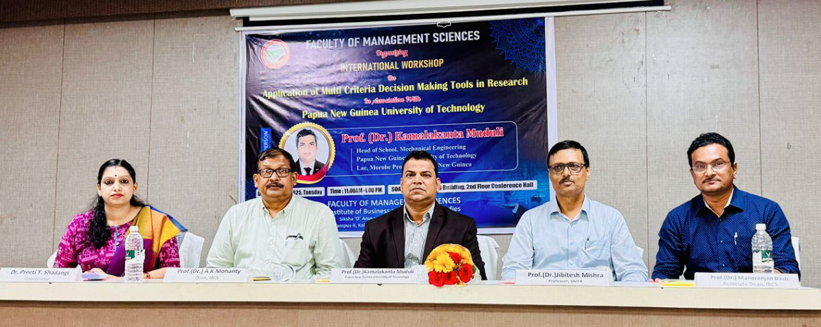 ଭୁବନେଶ୍ୱର: ଶିକ୍ଷା ଓ ଅନୁସନ୍ଧାନ (ସୋଆ) ପରିଚାଳିତ ଇନ୍‌ଷ୍ଟିଚ୍ୟୁଟ୍ ଅଫ୍ ବିଜିନେସ୍ ଆଣ୍ଡ କମ୍ପ୍ୟୁଟର ଷ୍ଟଡିଜ୍ (ଆଇବିସିଏସ୍‌) ପକ୍ଷରୁ ନିକଟରେ ‘ଆପ୍ଲିକେସନ୍ ଅଫ୍ ମଲ୍ଟି- କ୍ରାଇଟେରିଆ ଡିସିସନ୍ ମେକିଂ (ଏମ୍‌ସିଡିଏମ୍‌) ଟୁଲ୍‌ସ ଇନ୍ ରିସର୍ଚ୍ଚ’ ସମ୍ପର୍କିତ ଏକ ଆନ୍ତର୍ଜାତିକ କର୍ମଶାଳା  ଆୟୋଜିତ ହୋଇଯାଇଛି। ପାପୁଆ ନ୍ୟୁଗିନି ସ୍ଥିତ ପାପୁଆ ନ୍ୟୁଗିନି ୟୁନିଭର୍ସିଟି ଅଫ୍ ଟେକ୍ନୋଲଜିର ସହଯୋଗରେ ଏହି କର୍ମଶାଳାର ଆୟୋଜନ କରାଯାଇଥିଲା। କର୍ମଶାଳାକୁ ଓଡ଼ିଶା ବୈଷୟିକ ଓ ଗବେଷଣା ବିଶ୍ୱବିଦ୍ୟାଳୟର ଛାତ୍ର ମଙ୍ଗଳ ଡିନ୍ ତଥା କମ୍ପ୍ୟୁଟର ସାଇନ୍ସ ଆଣ୍ଡ ଆପ୍ଲିକେସନ୍ସ ବିଭାଗର ପ୍ରଫେସର (ଡକ୍ଟର) ଜିବିତେଶ ମିଶ୍ର ଉଦ୍‌ଘାଟନ କରିବା ଅବସରରେ ଏମ୍‌ସିଡିଏମ୍ ଟୁଲ୍‌ସର ମହତ୍ୱ ଉପରେ ଗୁରୁତ୍ୱାରୋପ କରି ଏହା କିଭଳି ବିଶ୍ୱସ୍ତରରେ ବ୍ୟବସାୟିକ ପରିବେଶର ଅସ୍ଥିତ୍ୱ ଜାହିର କରୁଛି ସେ ସମ୍ପର୍କରେ ମତବ୍ୟକ୍ତ କରିଥିଲେ। କାର୍ଯ୍ୟକ୍ରମରେ ଆଇବିସିଏସ୍‌ର ଡିନ୍ ପ୍ରଫେସର ଅୟସକାନ୍ତ ମହାନ୍ତି ଅଧ୍ୟକ୍ଷତା କରିଥିବା ବେଳେ ଆସୋସିଏଟ୍ ଡିନ୍ ପ୍ରଫେସର ମନୋରଞ୍ଜନ ଦାଶ ବକ୍ତବ୍ୟ ରଖିଥିଲେ। ବୈଷୟିକ ପର୍ଯ୍ୟାୟ ଗୁଡ଼ିକୁ ପାପୁଆ ନ୍ୟୁଗିନି ୟୁନିଭର୍ସିଟି ଅଫ୍ ଟେକ୍ନୋଲଜିର ମେକାନିକାଲ୍ ଇଞ୍ଜିନିୟରିଂ ବିଭାଗର ମୁଖ୍ୟ ପ୍ରଫେସର କମଳାକାନ୍ତ ମୁଦୁଲି ପରିଚାଳନା କରି ପରିଚାଳନା ଗବେଷଣା କ୍ଷେତ୍ରରେ ଏମ୍‌ସିଡିଏମ୍‌ର ବ୍ୟବହାରିକ କାର୍ଯ୍ୟଧାରା ସମ୍ପର୍କରେ ଗୁରୁତ୍ୱାରୋପ କରିଥିଲେ। କର୍ମଶାଳାକୁ ଆଇବିସିଏସ୍‌ର ଆସୋସିଏଟ୍ ପ୍ରଫେସର ଡକ୍ଟର ବିଭୁତି ଭୂଷଣ ମିଶ୍ର ଏବଂ ଆସିଷ୍ଟାଂଟ ପ୍ରଫେସର ଡକ୍ଟର ପ୍ରିତି ୱାଇ ଷଡ଼ଙ୍ଗୀ ପରିଚାଳନା କରିଥିଲେ।