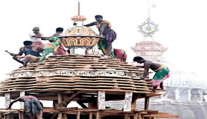 ପୁରୀ: ରଥ ନିର୍ମାଣ କାର୍ଯ୍ୟ ୫୩ ଦିନରେ ପହଞ୍ଚିଛି। ଗତକାଲି ସୁଦ୍ଧା ତିନିରଥର ୪ଟି ଲେଖାଏଁ ଦୁଆର ବେଢ଼ାରୁ ତିନି ରଥର ଆଗ, ପଛ ଦୁଆର ବେଢ଼ା ରଥ ଉପରକୁ ଉଠିଥିଲା। ଆଜି ଭୋଇ ସର୍ଦ୍ଦାର ରବି ଭୋଇଙ୍କ ନେତୃତ୍ୱରେ ତିନିରଥର ଭୋଇ ସେବକମାନେ ମିଶି ତିନି ରଥର ଦୁଇଟି ଲେଖାଏଁ ପାର୍ଶ୍ୱ ଦୁଆର ବେଢ଼ାକୁ ବାଉଁଶ ତେଣ୍ଟିଆ ସହାୟତାରେ ଉଠାଇ ନାଟ ଗୋଡ଼ ସହ ସଂଯୋଗ କରିଛନ୍ତି। ତିନିରଥର ଦୁଆର ବେଢ଼ାକୁ ମଜବୁତ୍ ରଖିବା ପାଇଁ ଦୁଆର ବେଢ଼ାଗୁଡ଼ିକର ଉପର ଭାଗ ଚନ୍ଦ୍ରଶାଳୀରେ ଧ୍ୱଜ ବତା ସଂଯୋଗ କରାଯାଇଛି। ମଝି ଭୂଇଁ ଶେଣିରେ କଣ୍ଟା ବସି ସେଟିଂ କରାଯାଇଛି। ଏଥିସହ ତିନି ରଥର ଦୁଆର ବେଢ଼ାକୁ ବାନ୍ଧି ରଖିବା ପାଇଁ ପ୍ରତି ଦୁଆର ବେଢ଼ାର ନାଟ ଗୋଡ଼ ସହ ଚଉଦ ନାହାକାରେ ଦୁଇଟି ଲେଖାଏଁ ସପୋର୍ଟ ବଟନ୍ ବା ଦୁଆର ବାଣିଆ ପ୍ରତି ରଥରେ ୧୬ଟି ଲେଖାଏଁ ଖଞ୍ଜାଯାଇଛି। ମହାରଣା ସେବକମାନେ ତିନି ରଥ ଭୋଇ ସେବକଙ୍କ ସହଯୋଗରେ ତିନି ରଥର ପ୍ରତି କୋଣଗୁଡ଼ିକରେ ଦୁଇଟି ଲେଖାଏଁ କଣି ଫାଉଡ଼ି ବସାଇଛନ୍ତି। ତିନିରଥ ଚାରି ପାର୍ଶ୍ବରେ ଦୁଇଟି ଲେଖାଏଁ ମଣ୍ଡଣୀବତା ପଡ଼ି ବଡ଼ଥଳ ପୋଟଳଠାରୁ ଚନ୍ଦ୍ର ଶାଳୀ ପର୍ଯ୍ୟନ୍ତ ଲାଗିଛି। ଆସନ୍ତାକାଲି ‘ହାତିଆଳ ମାଳ’ ବା କାଠ ବଟନ୍ ଆଠଟି ଲେଖାଏଁ ବଡ଼ ଥଳ ପୋଟଳ ଠାରୁ ଦୁଆର ବେଢ଼ା ପର୍ଯ୍ୟନ୍ତ ଖଞ୍ଜା ଯିବ ।