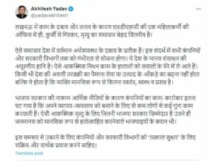 “ବିଜେପି ସରକାରଙ୍କ ବିଫଳ ଅର୍ଥନୈତିକ ନୀତି ଯୋଗୁଁ କମ୍ପାନୀଗୁଡିକର ବ୍ୟବସାୟ ଏତେ ହ୍ରାସ ପାଇଛି ଯେ ସେମାନଙ୍କ ବ୍ୟବସାୟକୁ ବଞ୍ଚାଇବା ପାଇଁ ସେମାନେ କମ୍ ଲୋକଙ୍କୁ ନେଇ କାମ କରାଇ ଚାପ ପକାନ୍ତି। ଆକସ୍ମିକ ମୃତ୍ୟୁ ପାଇଁ ବିଜେପି ସରକାର ଦାୟୀ। ଜନସାଧାରଣଙ୍କୁ ମାନସିକ ସ୍ତରରେ ହତାଶ କରୁଥିବା ବିଜେପି ନେତାଙ୍କ ବିଷୟରେ ସେ ଟୁଇଟ୍ କରିଛନ୍ତି। ଏହି ସମସ୍ୟାକୁ ଦୂର କରିବା ପାଇଁ କମ୍ପାନୀ ଏବଂ ସରକାରୀ ବିଭାଗଗୁଡ଼ିକ ତୁରନ୍ତ ଉନ୍ନତି ପାଇଁ ସକ୍ରିୟ ଏବଂ ଅର୍ଥପୂର୍ଣ୍ଣ ପ୍ରୟାସ କରିବା ଉଚିତ ବୋଲି ତାଙ୍କ ପୋଷ୍ଟରେ ଉଲ୍ଲେଖ କରିଛନ୍ତି।
