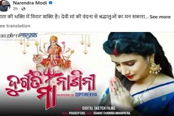 ନୂଆଦିଲ୍ଲୀ: ପ୍ରଧାନମନ୍ତ୍ରୀ ନରେନ୍ଦ୍ର ମୋଦିଙ୍କ ସୋସିଆଲ୍ ମିଡିଆ ପେଜ୍‌ରେ ଓଡ଼ିଆ କଣ୍ଠଶିଳ୍ପୀ ଦୀପ୍ତିରେଖା ପାଢ଼ୀଙ୍କ ଗୀତ । ଚୈତ୍ର ନବରାତ୍ରୀ ଅବସରରେ ପ୍ରଧାନମନ୍ତ୍ରୀ ନରେନ୍ଦ୍ର ମୋଦି ନିଜ ସୋସିଆଲ୍ ମିଡିଆ ପେଜ୍‌ରେ ଏକ ଭକ୍ତିମୟ ଓଡ଼ିଆ ଗୀତର ୟୁଟ୍ୟୁବ୍‌ ଲିଙ୍କ୍ ସେୟାର କରିଛନ୍ତି । ଗୀତର ନାଁ ରହିଛି ଦୁର୍ଗତିନାଶିନୀ ମାଆ ।ଏହି ଗୀତକୁ ଗାଇଛନ୍ତି ଓଡ଼ିଆ କଣ୍ଠଶିଳ୍ପୀ ଦୀପ୍ତିରେଖା ପାଢ଼ୀ। ମାଆଙ୍କର ଭକ୍ତିରେ ବିରାଟ ଶକ୍ତି ରହିଛି। ଦେବୀ ମାଆଙ୍କ ବନ୍ଦନାରେ ସ୍ରଦ୍ଧାଳୁଙ୍କ ମନ ସକାରାତ୍ମକ ଉର୍ଜାରେ ଭରିଯାଏ ବୋଲି ଲେଖିଛନ୍ତି ପ୍ରଧାନମନ୍ତ୍ରୀ ନରେନ୍ଦ୍ର ମୋଦି ।