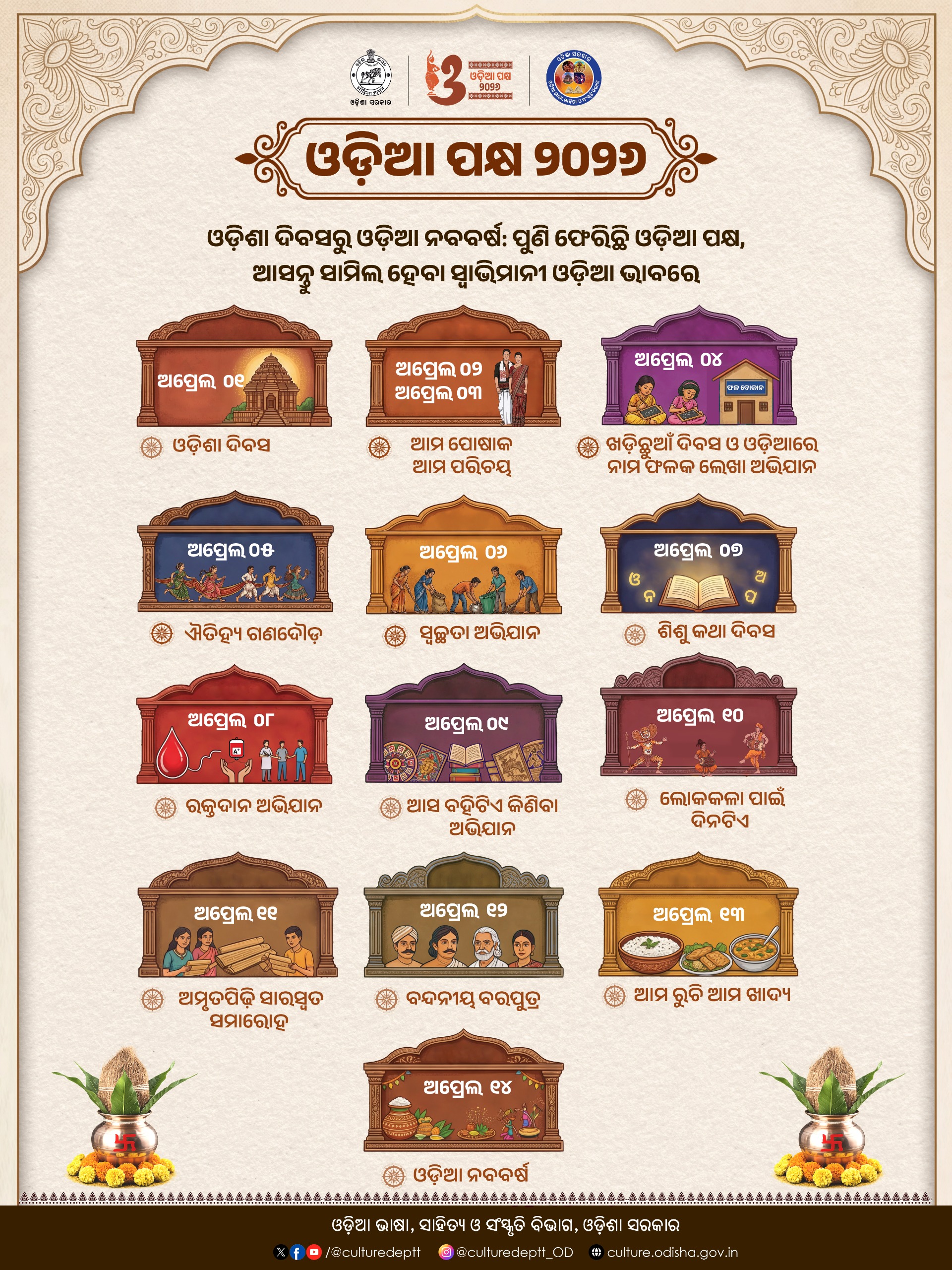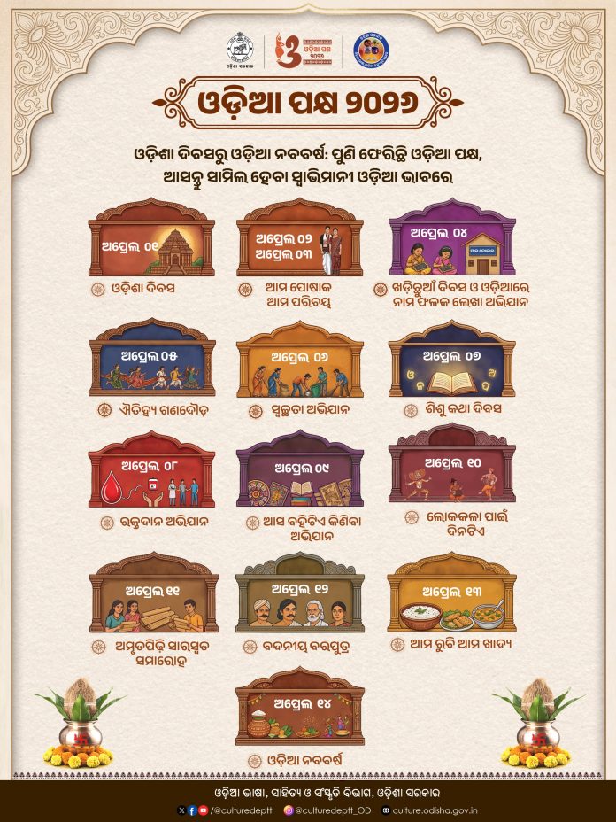 ଓଡ଼ିଶାର ହସ୍ତତନ୍ତ ବସ୍ତ୍ର ପରିଧାନ କରି ଏହାର ସ୍ୱଚିତ୍ର ଉତ୍ତୋଳନ କରି (ସେଲ୍ଫି ଉଠାଇ) ଏହାକୁ ଓଡ଼ିଆ ପକ୍ଷ ୱେବ୍ସାଇଟ (Odiapakhya.com) ରେ ଅପଲୋଡ଼ କରିବାକୁ ହସ୍ତତନ୍ତ, ବୟନ ଓ ହସ୍ତଶିଳ୍ପ ବିଭାଗ ପକ୍ଷରୁକୁହାଯାଇଛି। ଏଥିସହ ଏପ୍ରିଲ ୧ ତାରିଖରୁ ୧୪ ତାରିଖ ପର୍ଯ୍ୟନ୍ତ ହସ୍ତତନ୍ତ, ବୟନ ଓ ହସ୍ତଶିଳ୍ପ ବିଭାଗ ଦ୍ୱାରା ପରିଚାଳିତ ବୟନିକା, ଉତ୍କଳିକା, ରେଶମ ଓଡ଼ିଶା ଓ ସମ୍ବଲପୁରୀ ବସ୍ତ୍ରାଳୟର ସମସ୍ତ ଶାଖାରେ ହସ୍ତତନ୍ତ ବସ୍ତ୍ର କ୍ରୟ ଉପରେ ଶତକଡ଼ା ୨୦+୧୦ ଭାଗ ରିହାତି ପ୍ରଦାନ କରାଯାଉଛି। ଏପ୍ରିଲ ୪ ତାରିଖ ଦିନ ବିଦ୍ୟାଳୟ ଓ ଗଣଶିକ୍ଷା ବିଭାଗ ପକ୍ଷରୁ ଖଡ଼ିଛୁଆଁ ଓ ପ୍ରବେଶ ଉତ୍ସବ ଏବଂ ଶ୍ରମ ଓ କର୍ମଚାରୀ ରାଜ୍ୟ ବୀମା ବିଭାଗ ପକ୍ଷରୁ ଓଡ଼ିଆରେ ନାମ ଫଳକ ଲେଖା ଅଭିଯାନର ଆୟୋଜନ କରାଯିବ। ସୂଚନାଯୋଗ୍ୟ ଯେ, ଓଡ଼ିଆ ସଂସ୍କୃତିକୁ ବିଶ୍ୱବିଦିତ କରିବା ଲକ୍ଷ୍ୟ ନେଇ ଆମ ଯୁବପିଢ଼ିଙ୍କୁ ଓଡ଼ିଆ ସଂସ୍କୃତି ସହ ପୁନଃ ସଂଯୋଜିତ କରିବା ପାଇଁ ଓଡ଼ିଶାର ସମସ୍ତ ବ୍ଲକରୁ ରାଜଧାନୀ ଭୁବନେଶ୍ୱର ପର୍ଯ୍ୟନ୍ତ ଓଡ଼ିଆ ପକ୍ଷ ପାଳନ କରାଯାଉଛି। ଓଡ଼ିଆ ପକ୍ଷ ପାଳନର ପ୍ରତ୍ୟେକ ଦିନ ସରକାରଙ୍କ ବିଭିନ୍ନ ବିଭାଗ ପକ୍ଷରୁ ବିଭିନ୍ନ କାର୍ଯ୍ୟକ୍ରମର ଆୟୋଜନ କରାଯାଉଛି।