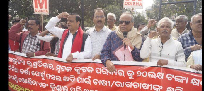 ଭୁବନେଶ୍ୱର : ସଂଯୁକ୍ତ କୃଷକ ମୋର୍ଚ୍ଚା ତରଫରୁ ଆହୂତ ଚେତାବନୀ ସମାବେଶ ପରିପ୍ରେକ୍ଷୀରେ ଭୁବନେଶ୍ୱର ମହାତ୍ମାଗାନ୍ଧୀ ମାର୍ଗଠାରେ ପଟୁଆର ଏବଂ ବିକ୍ଷୋଭ ପ୍ରଦର୍ଶନ କରାଯାଇଛି । କୃଷକ ଆତ୍ମହତ୍ୟାର ପ୍ରତିକାର, ମୃତକ କୃଷକ ପରିବାରକୁ ୨୦ଲକ୍ଷ ଟଙ୍କା କ୍ଷତିପୂରଣ, ଅଦିନିଆ ବର୍ଷା ଜନିତ ଫସଲ କ୍ଷତି ପାଇଁ ଚାଷୀ/ଭାଗଚାଷୀଙ୍କୁ ଉପଯୁକ୍ତ କ୍ଷତିପୂରଣ ଦେବା, ଆବଶ୍ୟକ ଅନୁଯାୟୀ ମଣ୍ଡି ଖୋଲିବା, କ୍ୱିଌକ୍ଷଗ୍ଧ;ାଲ ପ୍ରତି ୩୧୦୦/-ଟଙ୍କାରେ ଚାଷୀର ସବୁ ଧାନ କ୍ରୟ କରିବା ଏବଂ କୃଷକମାନଙ୍କୁ ଋଣରୁ ମୁକ୍ତି ଇତ୍ୟାଦି ଦାବି କରି ସଂଯୁକ୍ତ କୃଷକ ମୋର୍ଚ୍ଚା ତରଫରୁ ଭୁବନେଶ୍ୱର ମହାତ୍ମାଗାନ୍ଧୀ ମାର୍ଗରେ ପଟୁଆର ଏବଂ ବିକ୍ଷୋଭ ପ୍ରଦର୍ଶନ ହୋଇଛି ।