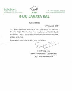 ଭୁବନେଶ୍ୱର : ମାଲକାନଗିରି ଜିଲ୍ଲା ମାଥିଲି ବ୍ଲକର ଜୋନ୍ ୩ ଜିଲ୍ଲା ପରିଷଦ ସଦସ୍ୟା ସସ୍ମିତା ମାଝୀଙ୍କୁ ଦଳ ବିରୋଧୀ କାର୍ଯ୍ୟ ପାଇଁ ବିଜୁ ଜନତା ଦଳର ସୁପ୍ରିମୋ ନବୀନ ପଟ୍ଟନାୟକ ଦଳରୁ ବହିଷୃତ କରିଛନ୍ତି ।