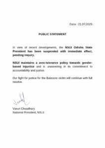 ଭୁବନେଶ୍ୱର: ଛାତ୍ର କଂଗ୍ରେସ ସଭାପତି ପଦରୁ ନିଲମ୍ବିତ ହେଲେ ଉଦିତ ପ୍ରଧାନ । ଦୁଷ୍କର୍ମ ଅଭିଯୋଗ ଆସିବା ପରେ ନିଲମ୍ବିତ ହୋଇଛନ୍ତି । ଏନେଇ ଏନଏସୟୁଆଇ ଜାତୀୟ ସଭାପତି ବରୁଣ ଚୌଧୁରୀ ସୂଚନା ଦେଇଛନ୍ତି । ପୀଡିତାଙ୍କ ବୟାନ ଆଧାରରେ ଗତକାଲି ଉଦିତ ପ୍ରଧାନଙ୍କୁ ଦୁଷ୍କର୍ମ ଅଭିଯୋଗରେ ଗିରଫ କରିଥିଲା ପୋଲିସ ।